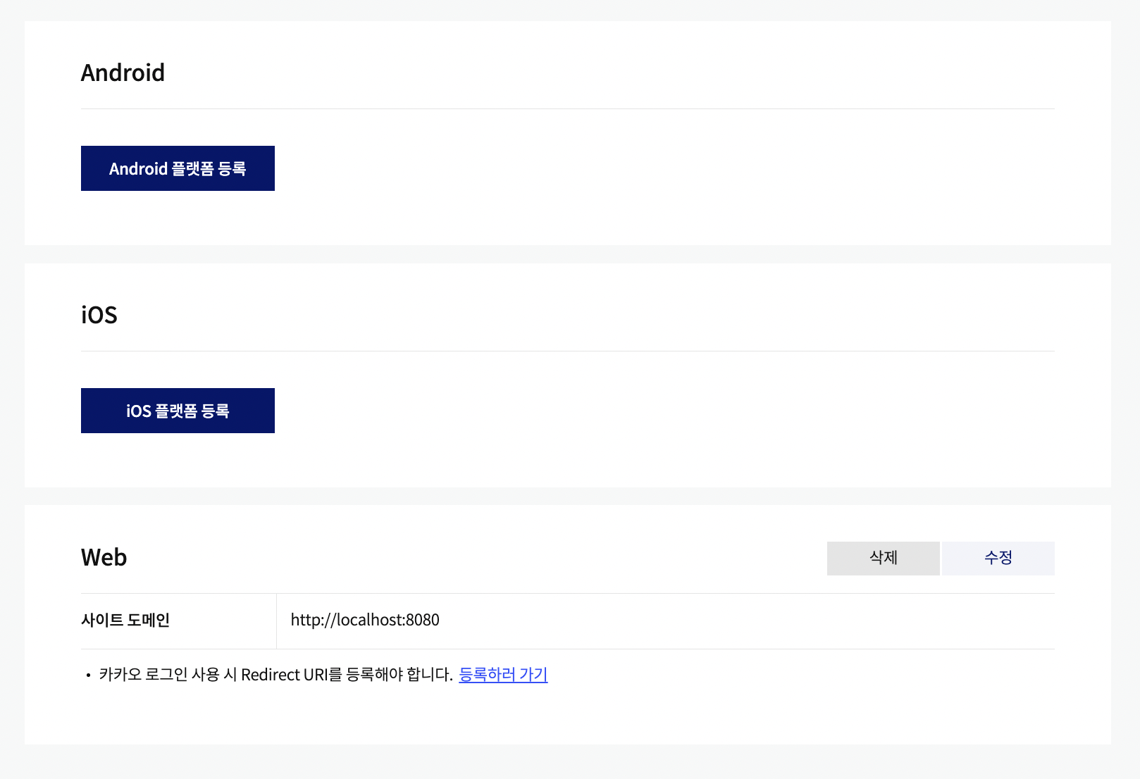 - 앱 설정 👉🏻 플랫폼 👉🏻Web 사이트 도메인 등록