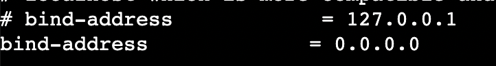 cd /etc/mysqlmariadb.conf.d/로 이동sudo vi 50-server.cnf로 50-server.cnf 열기- 26번째 줄(확실하지 않음) bind-address를 변경