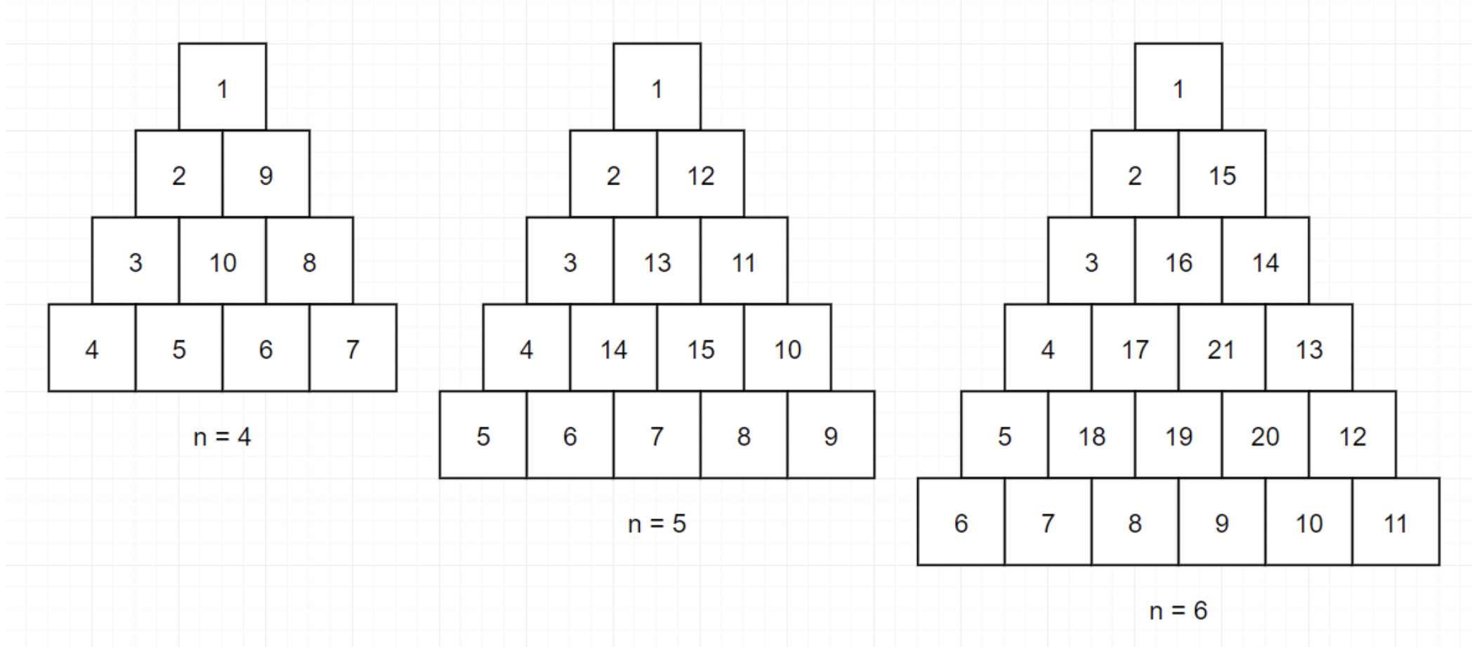 정수 n이 매개변수로 주어집니다. 다음 그림과 같이 밑변의 길이와 높이가 n인 삼각형에서 맨 위 꼭짓점부터 반시계 방향으로 달팽이 채우기를 진행한 후, 첫 행부터 마지막 행까지 모두 순서대로 합친 새로운 배열을 return 하도록 solution 함수를 완성해주세요.