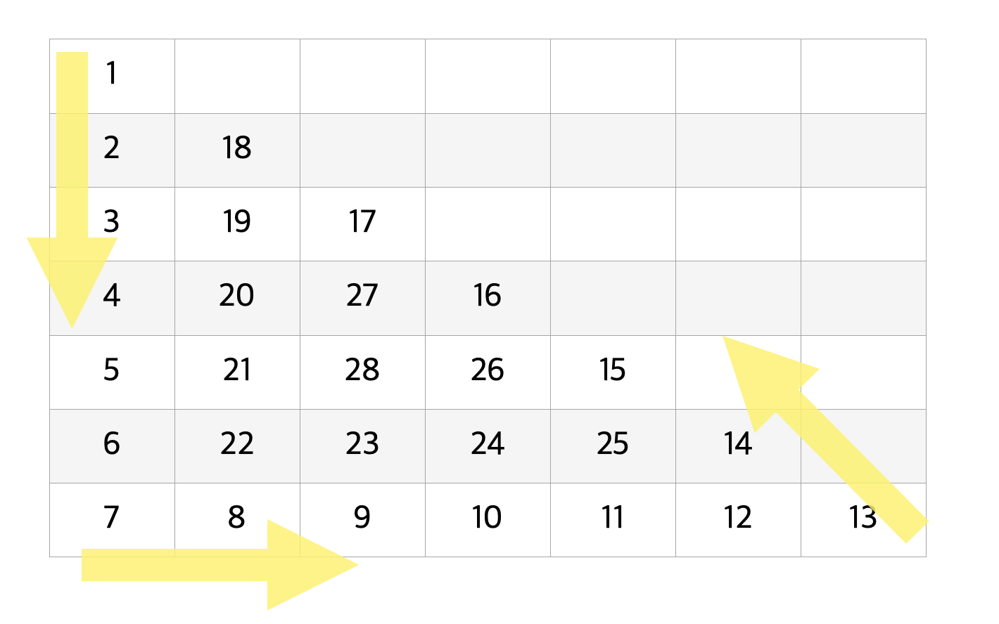 - 이차원 배열 안에서 아래로 움직이거나 옆으로 움직이거나 대각선 위로 움직이며 값을 넣어주어야 한다.